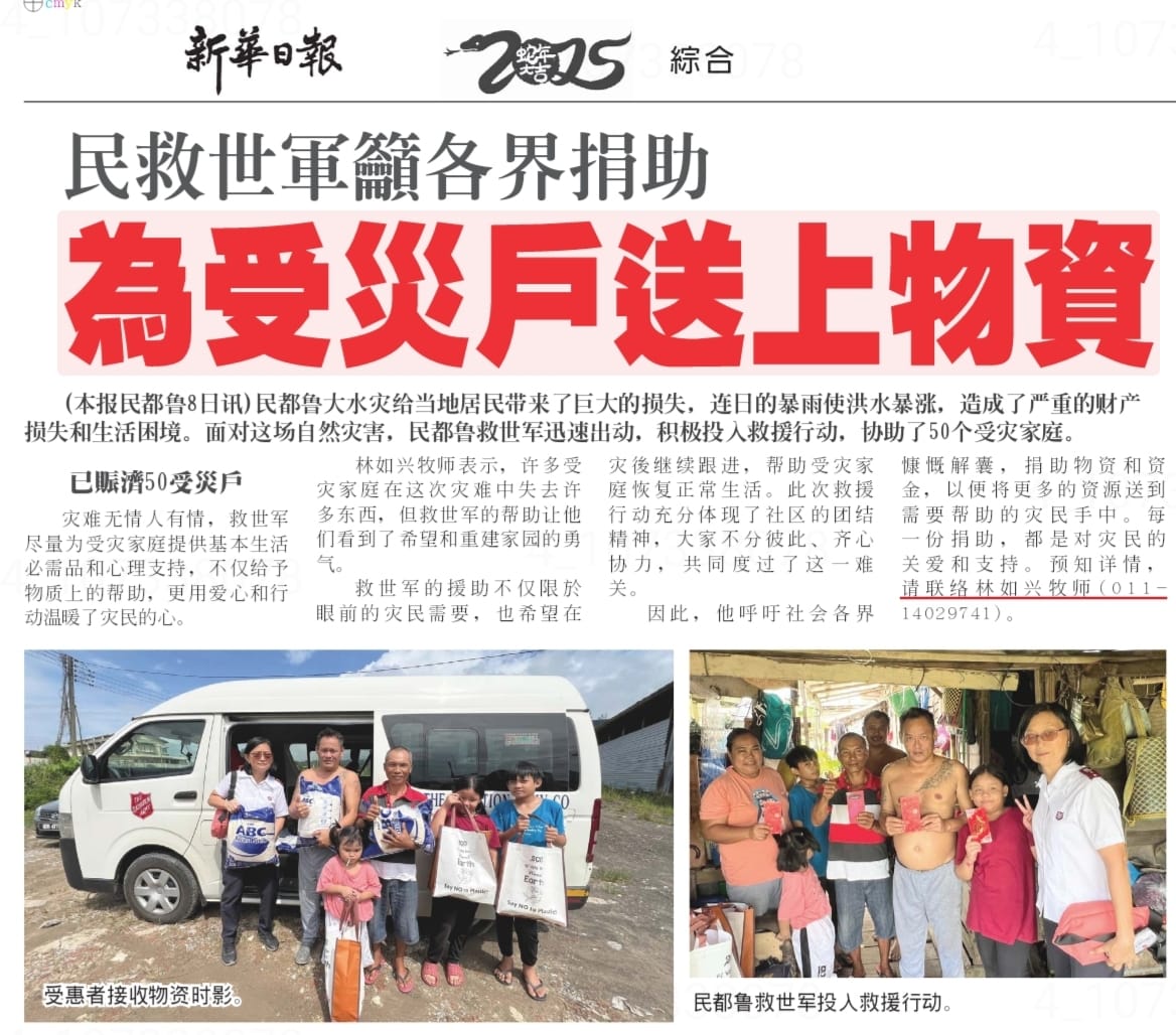 Home > Media Room > News News Sin Chew Daily News Sin Chew Daily News - Melaka Open Day 2025 17 August 2025 Dayak Daily Dayak Daily - Sale of Work 2025 18 August 2025 Utusan Sarawak Utusan Sarawak - PropNex Home Run 5 August 2025 Suara Sarawak Suara Sarawak - The Salvation Army Bintulu bantu mangsa kebakaran di Sungai Plan 14 Apr 2025 Borneo Post Borneo Post - Children of razed Rh Lapie receive new schools supplies from Salvation Army 13 Apr 2025 Sarawak Tribune Sarawak Tribune - Salvation Army Assists Families in Kuching 1 Mar 2025 Sin Chew Daily News Sin Chew Daily News - TSA responds with aid in Bintulu after floods 9 Feb 2025 See Hua Evening News See Hua Evening News - Bintulu TSA in action after floods 9 Feb 2025 Chinese News Chinese News - Dato Ngu Weng Hie Supports TSA work in Bintulu 10 Feb 2025 China Press China Press - 20K Grant for Ipoh Children's Home Care Centre 19 Jan 2025 Prev Page1 Page2 Page3 Page4 Page5 Next