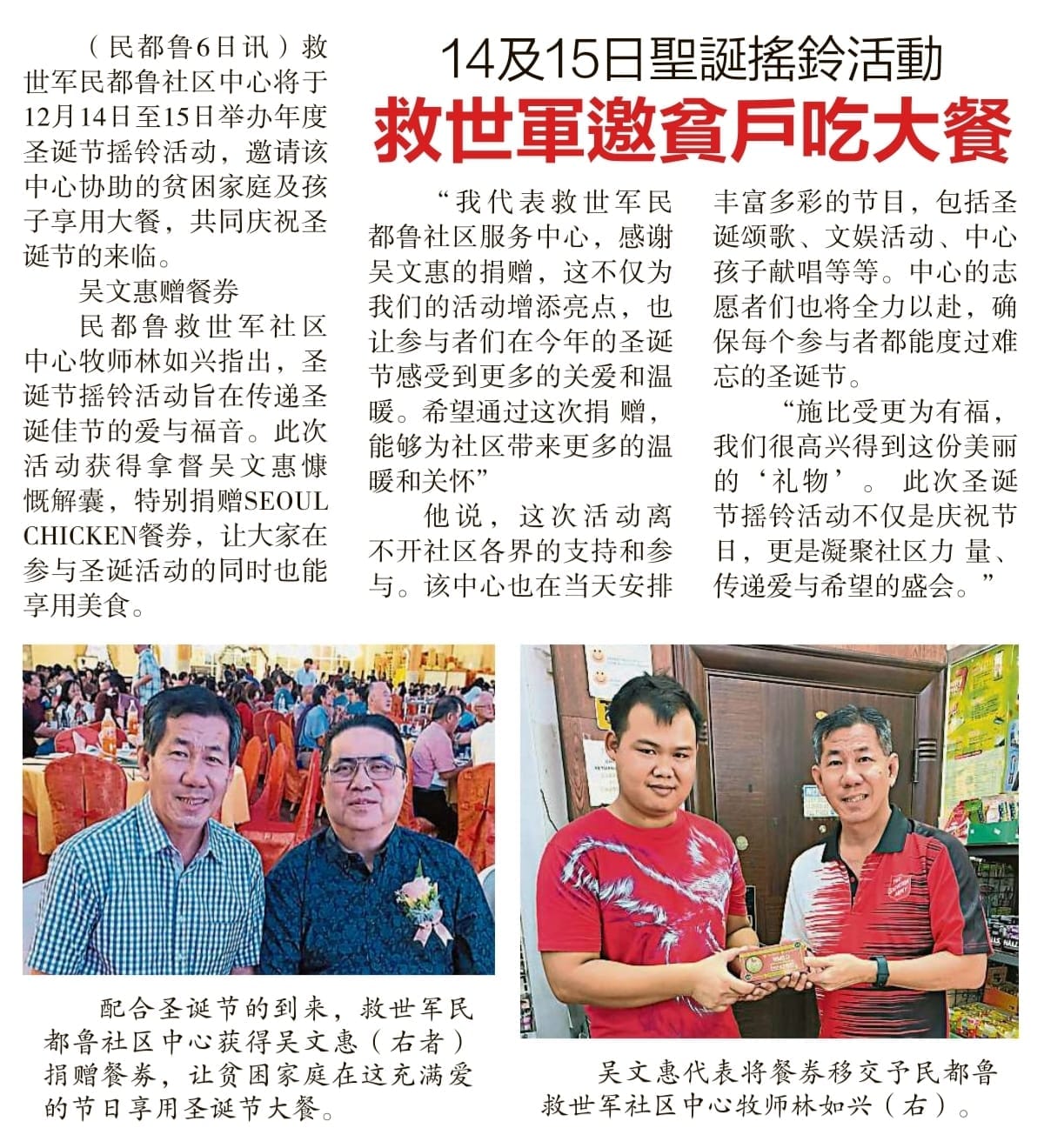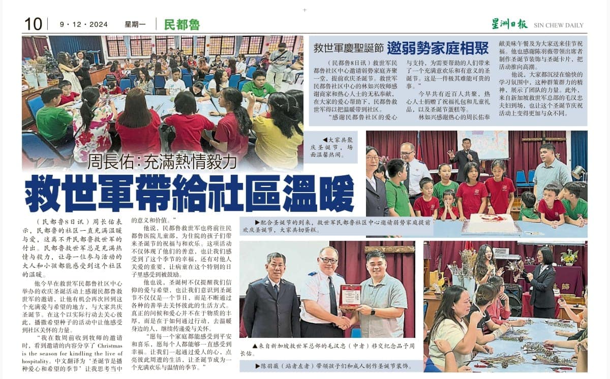 Home > Media Room > News News Borneo Post Borneo Post - Sarawak Government calls upon entrepreneurs to give back to society 16 Dec 2024 Borneo Post Borneo Post - Salvation Army Bintulu’s pre-Christmas events raise much-needed funds 17 Dec 2024 TSA Malaysia Facebook TSA Malaysia Facebook - Relief Efforts in Kelantan 11 Dec 2024 Borneo Post Borneo Post - Christmas Magic For Bintulu Hospital 10 Dec 2024 Bintulu Bintulu - Donation from Dato' Ngu Weng Hie 9 Dec 2024 Sin Chew Daily News Sin Chew Daily News - Bintulu Christmas Event 9 Dec 2024 China Press China Press - Million Hearts Care Together 6 Nov 2024 The War Cry The War Cry - Bintulu Fire November 2024 The War Cry The War Cry - Sale of Work in Kota Samarahan November 2024 Sin Chew Daily News Sin Chew Daily News - Bintulu 14 Oct 2024 Prev Page1 Page2 Page3 Page4 Page5 Next